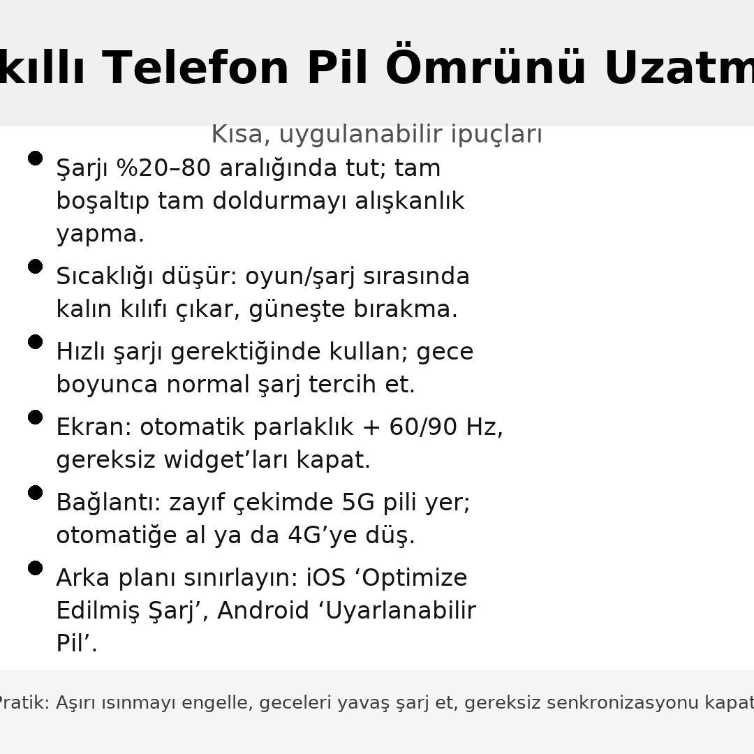 Kısa kural: Isıyı düşük, ekranı makul, arka planı kontrollü tut. %20–80 bandı idealdir.